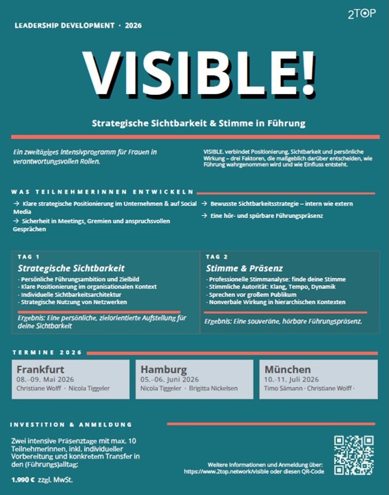 Es gibt zwei öffentliche Seminare, die ich im Rahmen meiner Tätigkeit als Stimmexpertin für 2TOP mitgestalte: „VISIBLE – Strategische Sichtbarkeit & Stimme in Führung.“ Das Intensivprogramm in kleiner Gruppe richtet sich an alle Frauen, die sich diese Frage stellen: Wie werde ich wirksam sichtbar, wie trete ich richtig auf, um mich und meine Expertise optimal zur Geltung zu bringen?